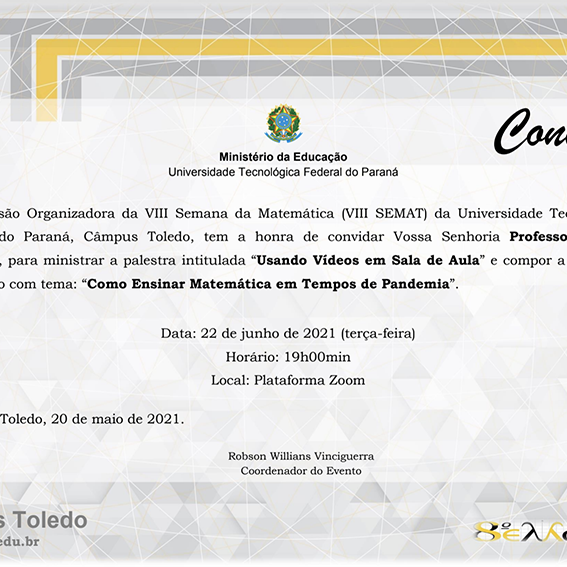 Participação em Mesa Redonda com título “Como Ensinar Matemática em Tempos de Pandemia” em VIII SEMAT da UTFPR em junho de 2021
